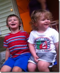 I served my delicious ribs and I must tell you that they were my best batch ever. That’s saying a lot because my ribs are the best. So we had our meal and waited for it to get a little dark so we could do our fireworks. The boys were just so excited. They were clapping and screaming and really had a great time. They were swapping laps between me, their mommy and Paw while daddy was in charge of firing off the fireworks. They are at the age right now that it is so much fun. Here’s a couple of pics of the boys watching the fireworks.